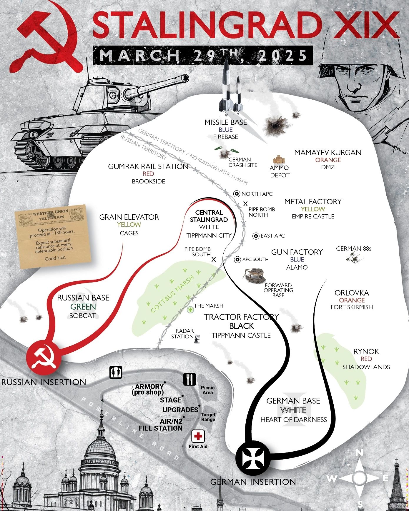 We may enter the field at 11:00 AM Saturday morning. Chrono then we are masks up and BARREL SOCKS ON until 11:30 for game on.